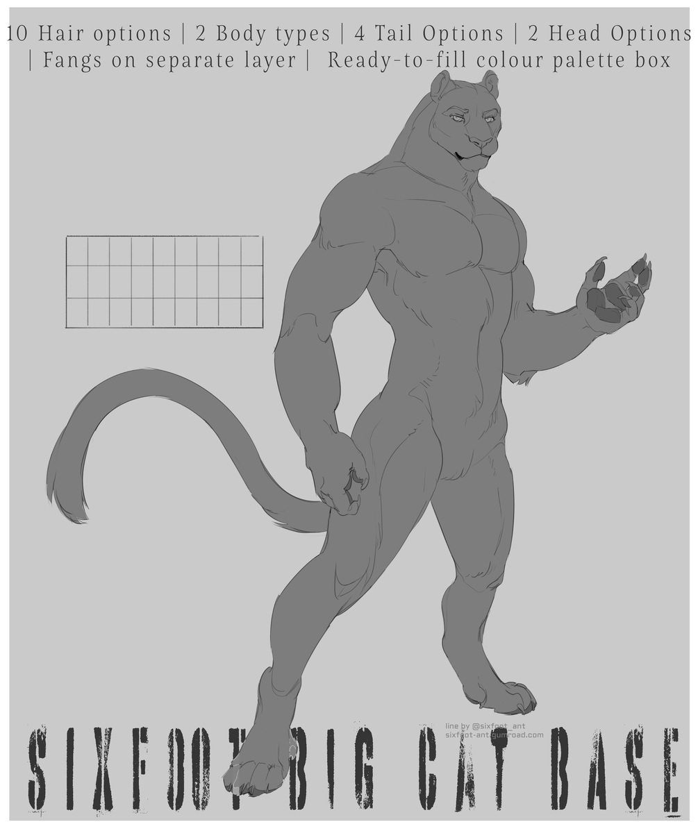 Make or sell your own big cat characters using this original PSD Base (line art). This download includes a Photoshop Document file (.psd) which can be opened in PaintTool SAI, Gimp, Photoshop and Clip Studio Paint.